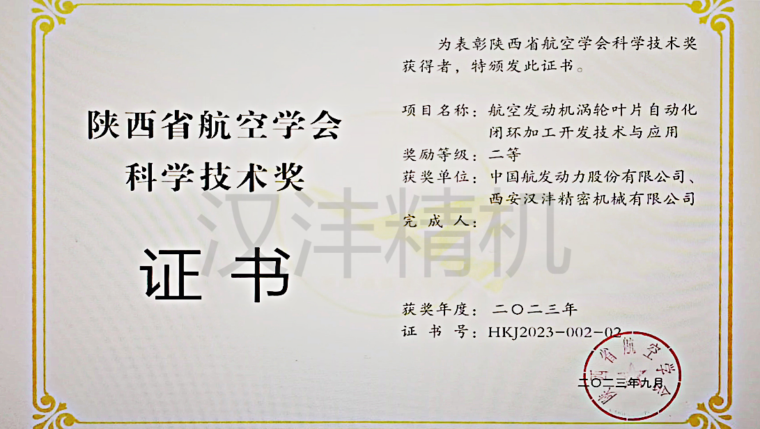 7.”航空发动机涡轮叶片自动化闭环加工开发技术与应用“项目联合获得2023年度陕西省航空学会科学技术奖二等奖。